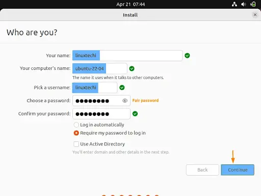 In Your name, enter your first name and surname. In username, enter your desired username. In Your Computer’s name, enter your username or a short name for the computer Keep other options as in photo